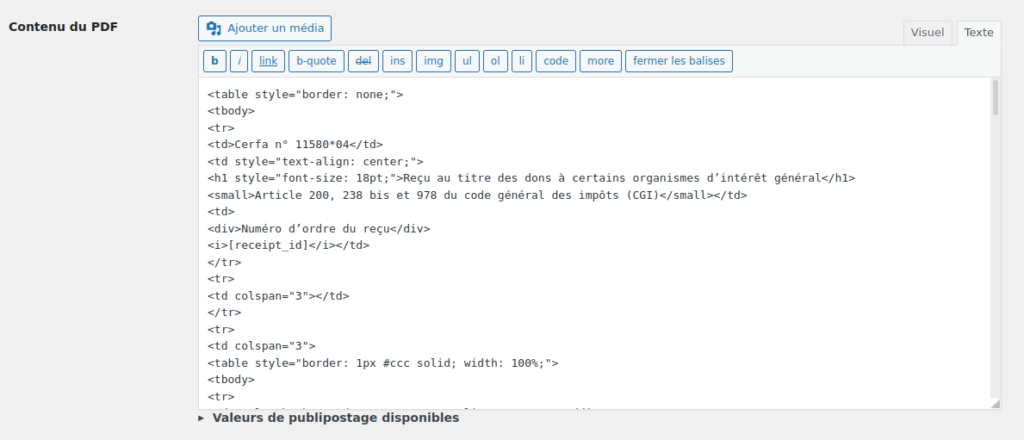 This is the content used to generate the one-time tax receipt. It can be composed of variables that are replaced depending on the user for whom it is generated: