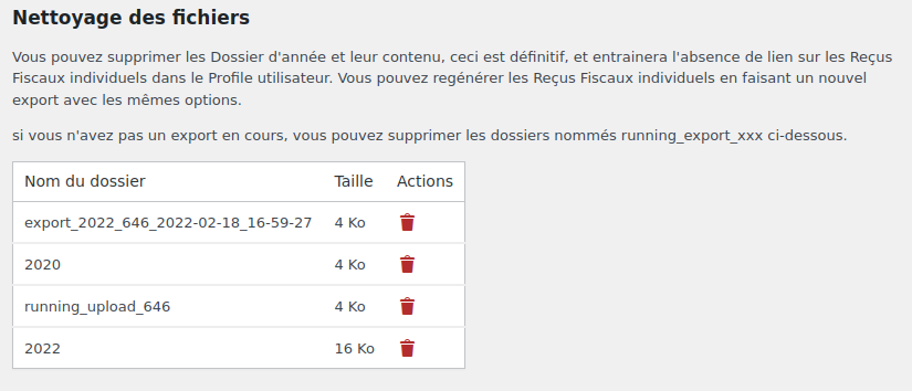 Tax receipts can be exported once a year to generate two CSV exports for a mail router, and as many times as necessary for a user.