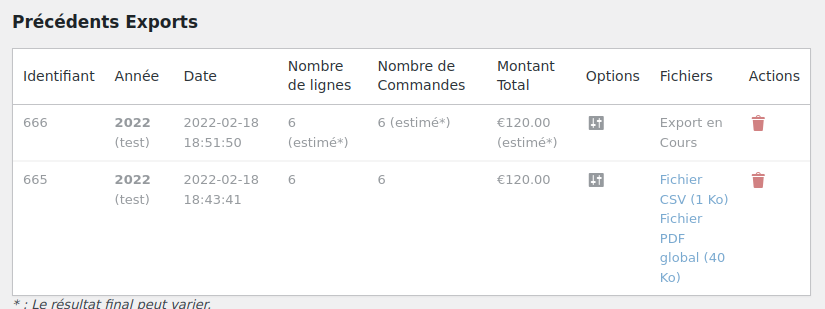 Please note that the number of lines, orders, and total amount are calculated using orders that meet the export criteria. Before creating the CSV file, the number of lines will decrease because users without a valid address and those who do not have a high enough cumulative minimum to receive a tax receipt must be removed.